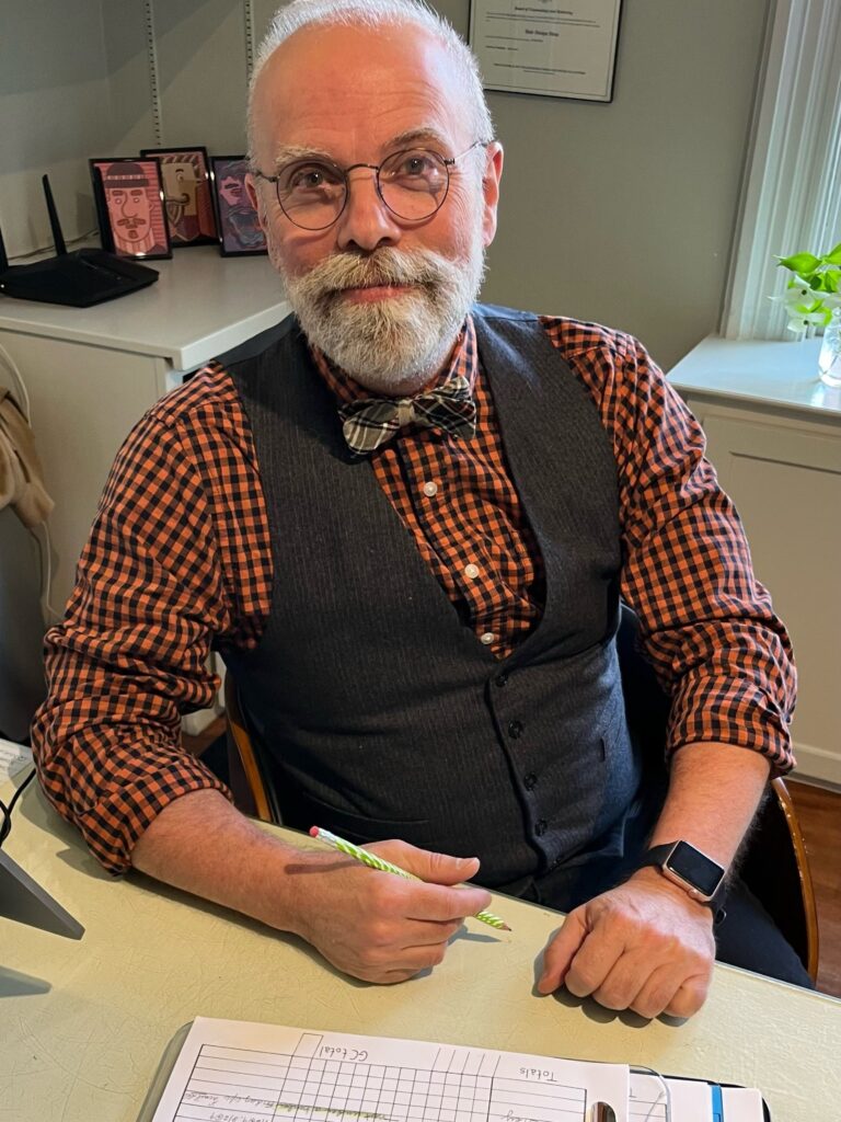 Roger Lemelin started as a Chez Moustache client, and now is the shop's front-man, keeping our barbers scheduled and on time. He is a retired Visual Arts Instructor, Theatre Artist, and recent UConn grad in Puppetry Arts.
