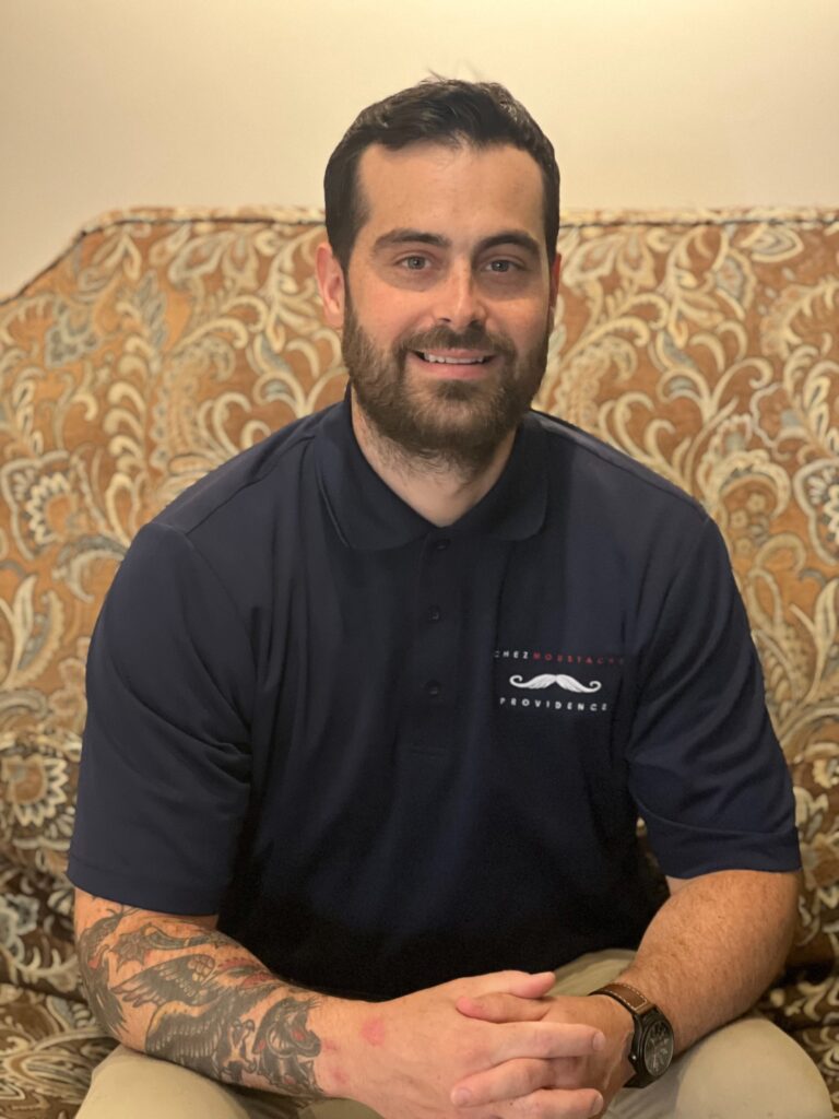 Zachary Gouldrup is a Master Barber licensed in RI and MA, and the Owner of Chez Moustache. He graduated from Rob Roy academy in 2009 and went to work in Massachusetts for 3 years before going to work in 2012 for Cheryl at Chez Moustache. In March 2023 he purchased the business from Cheryl and moved it to its current Elbow Street location. Zachary loves his craft, and especially enjoys working on beards and doing hot shaves. Zac has a deep appreciation for his clientele, many of which have been with him for many years. He enjoys making everyone who sits in his chair feel their very best. In his downtime, Zac enjoys spending time with his wife and 3 children.